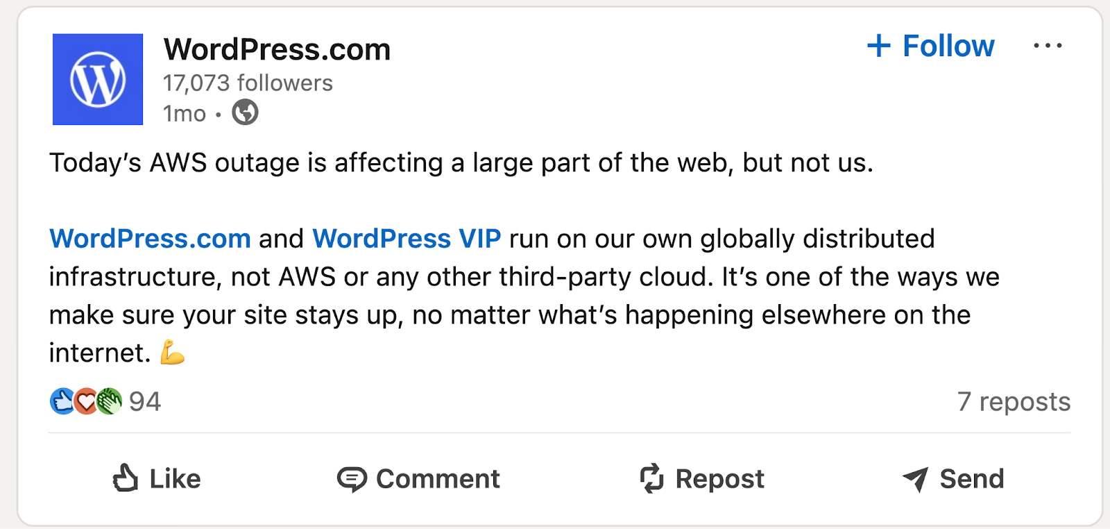 For instance, during a recent AWS outage that took many websites offline, WordPress.com sites continued running without interruption: